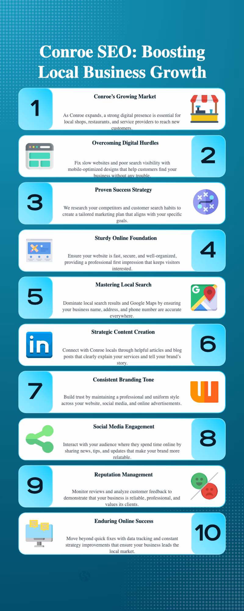 Infographic highlights actionable strategies for Conroe businesses to boost online visibility and local engagement.